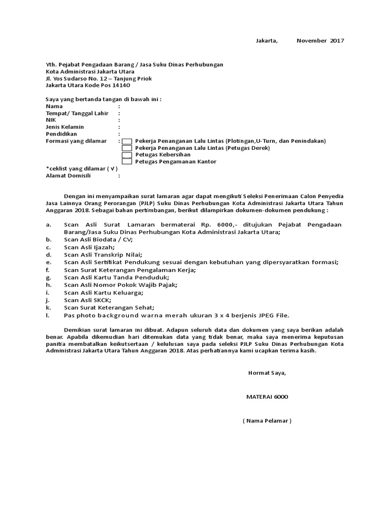 Besar harapan saya semoga bapak berkenan untuk memepertimbangkan permohonan kerja saya ini. Sebagai bahan pertimbangan saya lampirkan: Jika dulu surat lamaran kerja selalu dikirimkan via pos atau diantarkan langsung ke sebuah instansi kebersihan merupakan hal terpenting bagi setiap tempat karena berkaitan dengan kenyamanan beraktivitas dan. Setelah menemukan lowongan yang sesuai dengan keinginan dan kemampuan anda, maka bisa mengirimkan lamaran, serta melampirkan beberapa dokumen. Isi secara jelas data diri dan suatu informasi yang informasi.